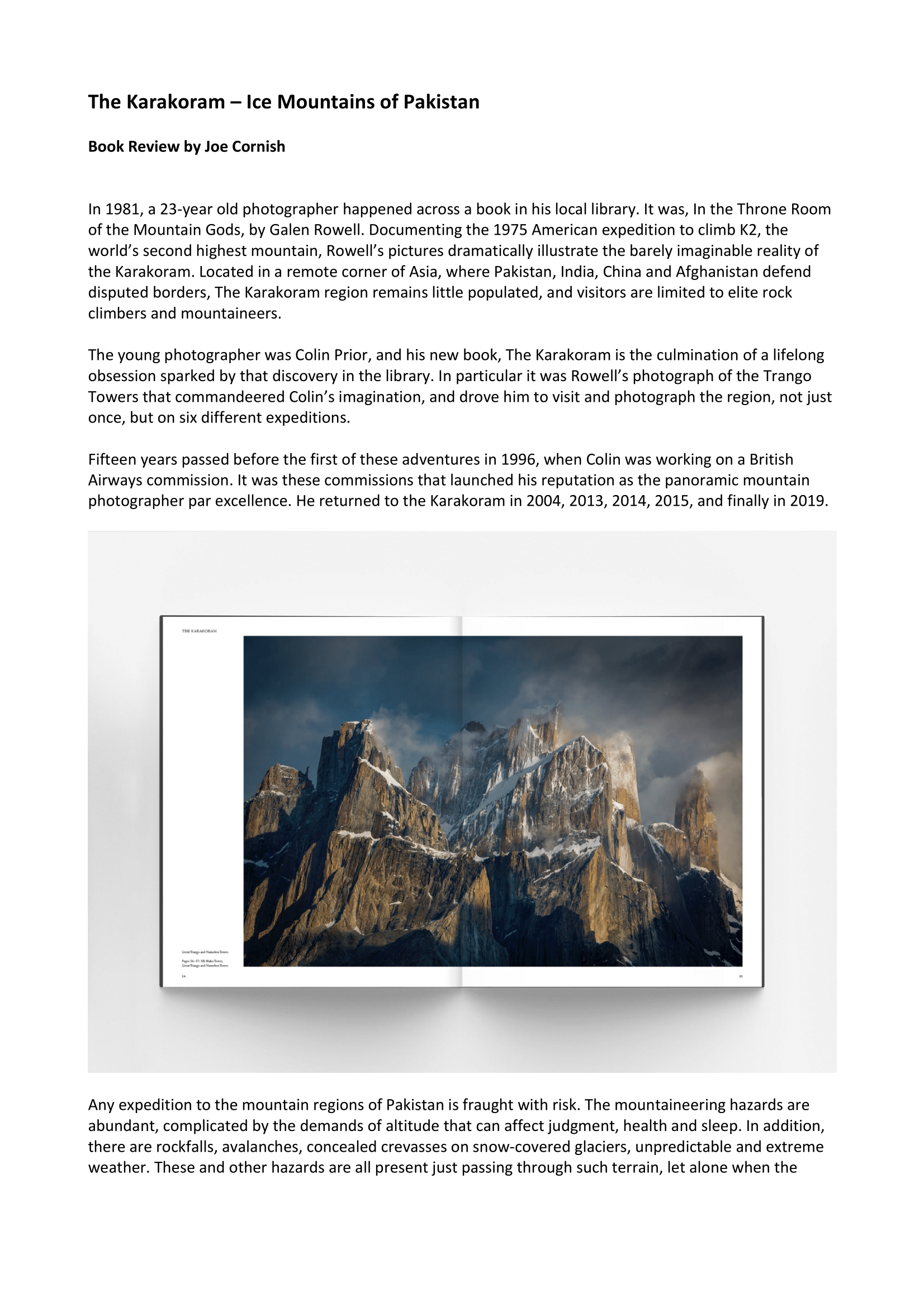 In 1981, a 23-year old photographer happened across a book in his local library. It was, In the Throne Room of the Mountain Gods, by Galen Rowell. Documenting the 1975 American expedition to climb K2, the world’s second highest mountain, Rowell’s pictures dramatically illustrate the barely imaginable reality of the Karakoram. Located in a remote corner of Asia, where Pakistan, India, China and Afghanistan defend disputed borders, The Karakoram region remains little populated, and visitors are limited to elite rock climbers and mountaineers. The young photographer was Colin Prior, and his new book, The Karakoram is the culmination of a lifelong obsession sparked by that discovery in the library. In particular it was Rowell’s photograph of the Trango Towers that commandeered Colin’s imagination, and drove him to visit and photograph the region, not just once, but on six different expeditions. Fifteen years passed before the first of these adventures in 1996, when Colin was working on a British Airways commission. It was these commissions that launched his reputation as the panoramic mountain photographer par excellence. He returned to the Karakoram in 2004, 2013, 2014, 2015, and finally in 2019...