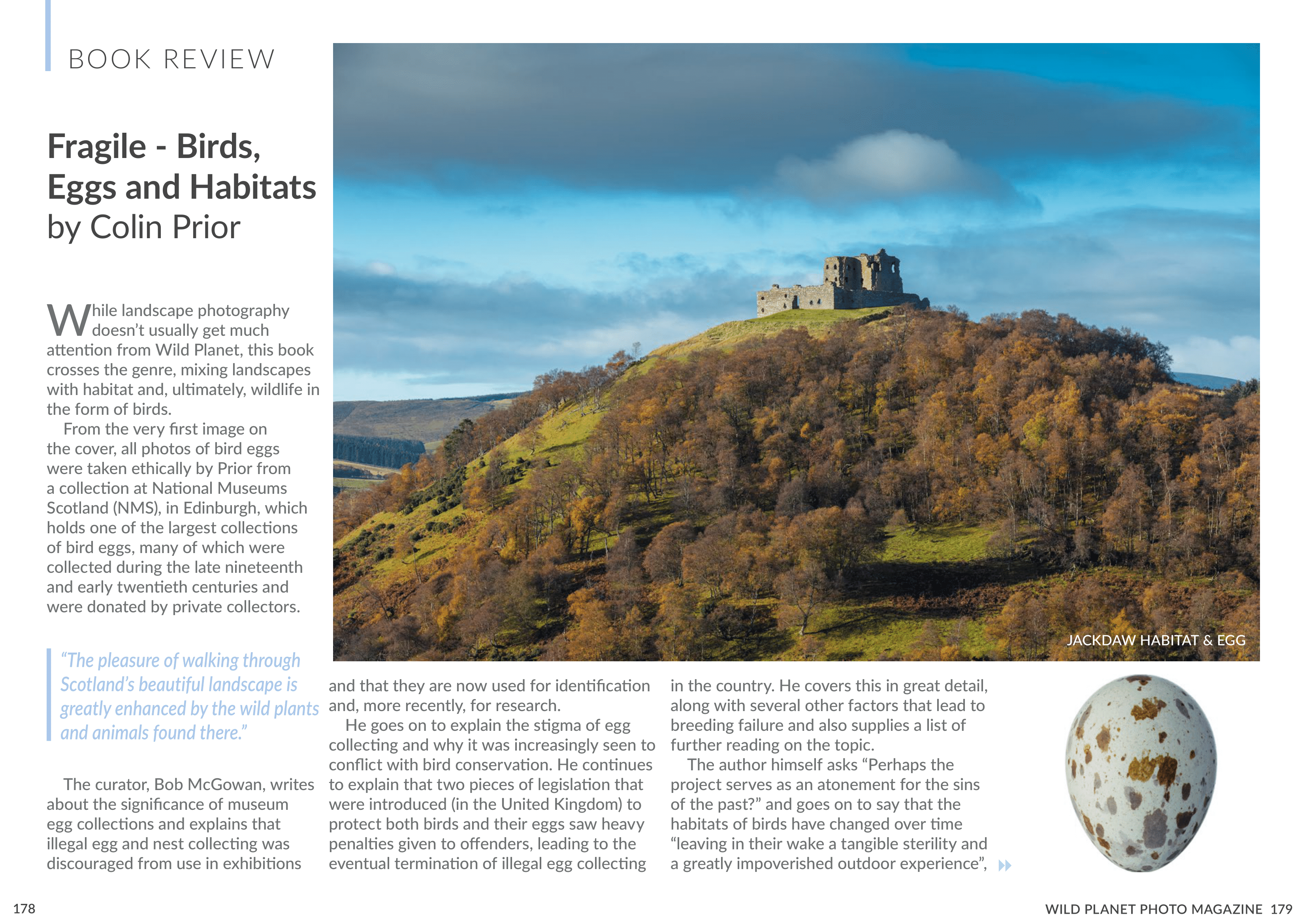 While landscape photography doesn’t usually get much attention from Wild Planet, this book crosses the genre, mixing landscapes with habitat and, ultimately, wildlife in the form of birds. From the very first image on the cover, all photos of bird eggs were taken ethically by Prior from a collection at National Museums Scotland (NMS), in Edinburgh, which holds one of the largest collections of bird eggs, many of which were collected during the late nineteenth and early twentieth centuries and were donated by private collectors. The curator, Bob McGowan, writes about the significance of museum egg collections and explains that illegal egg and nest collecting was discouraged from use in exhibitions “The pleasure of walking through Scotland’s beautiful landscape is greatly enhanced by the wild plants and animals found there.” 8 BOOK REVIEW and that they are now used for identification and, more recently, for research. He goes on to explain the stigma of egg collecting and why it was increasingly seen to conflict with bird conservation. He continues to explain that two pieces of legislation that were introduced (in the United Kingdom) to protect both birds and their eggs saw heavy penalties given to offenders, leading to the eventual termination of illegal egg collecting in the country. He covers this in great detail, along with several other factors that lead to breeding failure and also supplies a list of further reading on the topic. The author himself asks “Perhaps the project serves as an atonement for the sins of the past?” and goes on to say that the habitats of birds have changed over time “leaving in their wake a tangible sterility and a greatly impoverished outdoor experience”